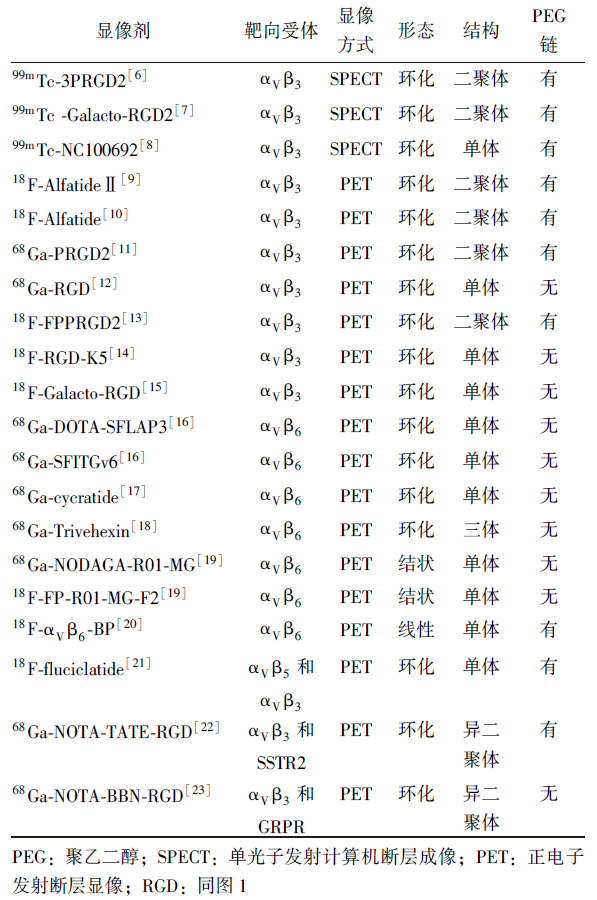 表1 已进入临床研究的整合素RGD受体显像剂及其特征