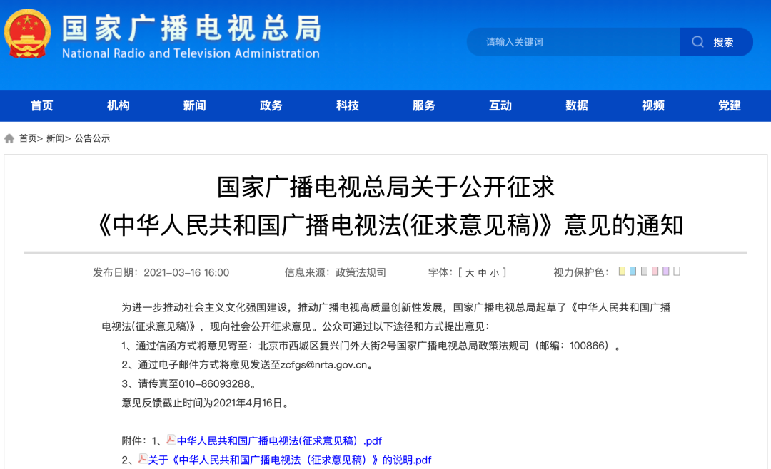 初步定型期(2021年至今)。2021年,行业基本法《广播电视法》正式向社会公开征求意见,2022年广播电视法草案被国务院预备提请全国人大常委会审议,标志着我国广播电视法律体系建设进入新阶段。主管部门还积极配合《民法典》《未成年人保护法》以及《应急广播管理暂行办法》《市场准入负面清单》等多部涉广电业务法律法规和规范性文件制修订工作,广播电视法规政策体系和法治环境进一步优化。广播电视治理体系和治理能力现代化也加快推进,进一步强化对突出问题、综合业务、融合业态的精准化生态化治理,努力把广播电视台办成讲导向、有文化的传播平台,管住用好网络视听平台,有效提升了广播电视电视和视听平台的媒体格调和文化品位,行业管理从管一隅向管一域、管脚下向管行业转变。