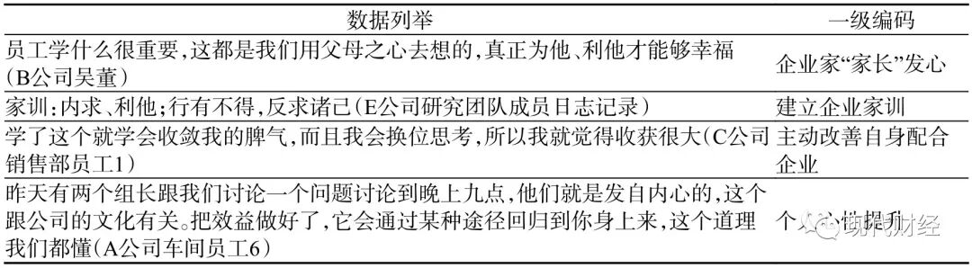 上述开放性编码数据主要来自企业管理层,为了解员工对企业育德的真实反馈,选择性编码采用了二次回访及新采集的员工层数据,检验企业育德概念是否有效。经过二次数据迭代,研究了解到,此类企业的德性育化首先从企业家本人开始,企业家自身长期修习传统文化,通过自我教育的反思来明确自身对企业如“家主”、对员工如“家长”的担当,而不是先要求员工付出。如D公司董事长马总的观点:“只要父母(领导)带头做了,你的孩子(员工)就跟着你学。”此类企业家认为,借助传统家族栽培子女的教育方式推广至全体员工,可帮助员工成长、谋求幸福。如A公司王副总评价企业家的发心:“从这两年所做的一切的事情,我们也看到他(张董事长)这种决心,就是非常真诚的,一颗真诚心,去为员工谋幸福。”E公司亦看重全体员工的成长:“人怎么样才能幸福?让他成长。只要涉及到成长的,我们叫价值观统一,哲学共有。(E公司文化部负责人D经理)”这种教育理念尤其重视全员学习,从企业一把手到基层员工、甚至实习生都强调全员的长期轮训,这与一般企业的技能培训截然不同。在做法上,企业主张从《弟子规》《孝经》等文化经典中汲取教育方略,凝练成为企业哲学,并将这些内容称为“家训”,如B公司的企业家训为:内求利他;F公司则将五常的“仁、义、礼、智、信”对照企业经营实际分别注解,发展为整个企业的家训,各个班组又自发书写各自的“小家”家训。具体的教育方式则是借鉴传统家族中教育子女的言教、身教、境教方法,尽力做到“时时”“事事”都能给予员工教育启发。