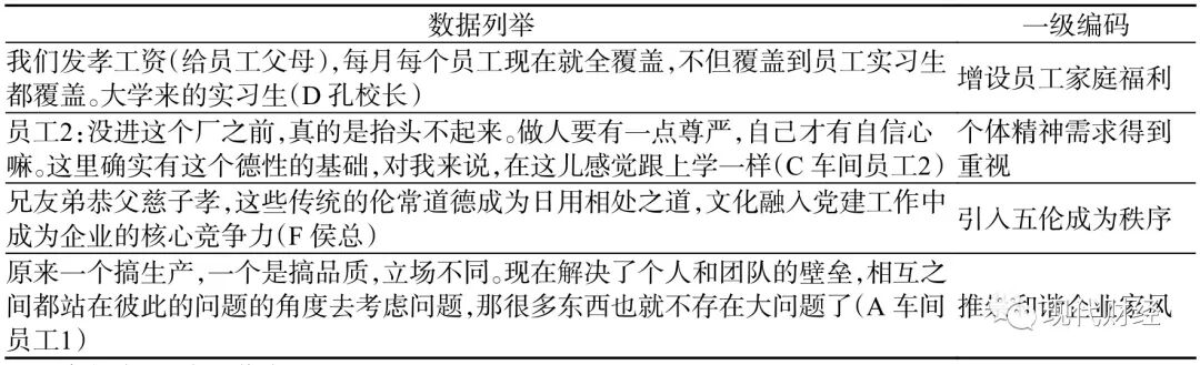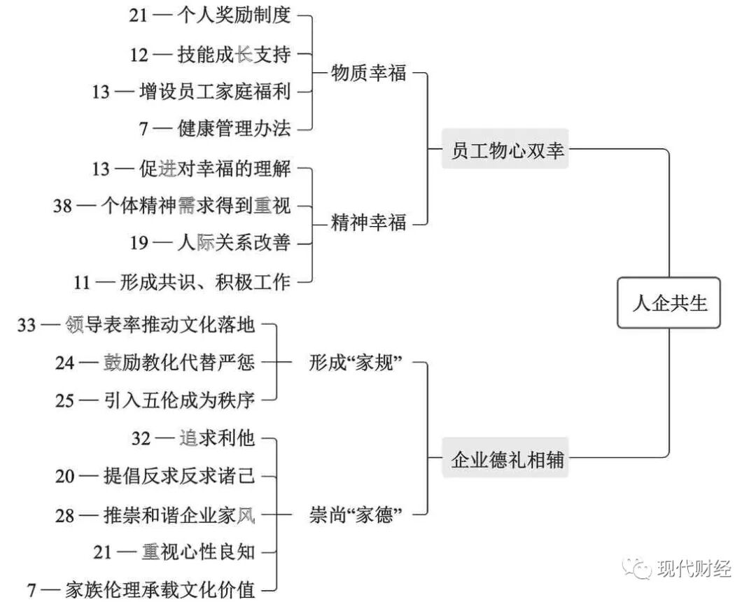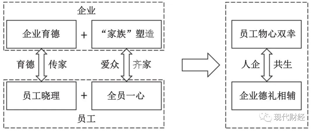 在“家族”风貌形成的过程中,员工在提供教育与关怀支持的企业“家族”中成长,收获物质与精神的双重幸福,因而信任与回馈企业,企业也得到德性与制度并存的新形态。通过上述提到的细节例证,研究发现这种关系的形成并非简单复制传统家族主义的一套为己所用的方法与逻辑,6家企业主要发扬了家文化良性可持续元素,同时改良、摒弃了不适用于全员与企业协同发展的内容,而企业与员工在其中各有所得,相互依存,形成了一种共生共享的关系。综上,本研究进一步将员工物心双幸和企业德礼相辅两个三级编码提炼为人企共生(编码过程详见图3,关键概念数据列举见表4)。