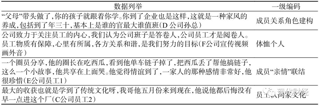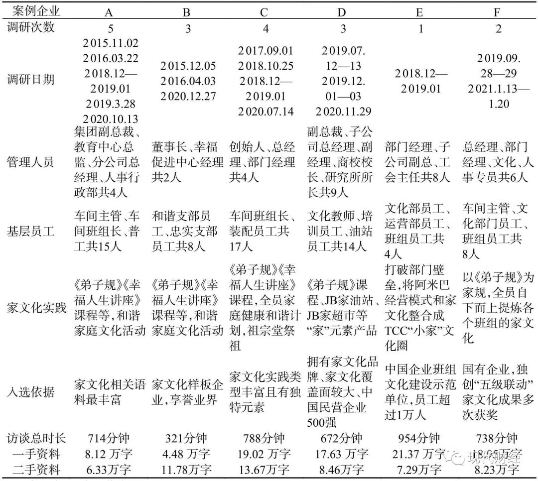 在扎根理论研究过程中,抽样的最初阶段包含了目的性抽样的要素,即研究者必须知道从何处进行采样,以及这些采样可以到达何处(Glaser,1998)。在研究初期,现象的探索是开放性的,在不作预设的情况下,研究团队接触到A公司,观察到A具有浓郁的“家族”氛围,并了解到A公司的家文化已推广至全员实践,且赢得了员工的广泛认同,在管理上取得了成效。而A的实践灵感则来自于B公司,A公司介绍,B在此方面的实践更加深入且成体系。随后研究人员继续走访并了解了B的家文化模式,走访发现,两家公司的家文化均广受员工认可,且成效斐然。从中确定了“家文化赢得员工广泛认同”“家文化取得实践成效”两个信息节点作为抽样目的,在后续的调研中选取了C、D、E与F此4个满足条件的企业作为样本,使本研究的故事线索在逻辑上具有可复制性。