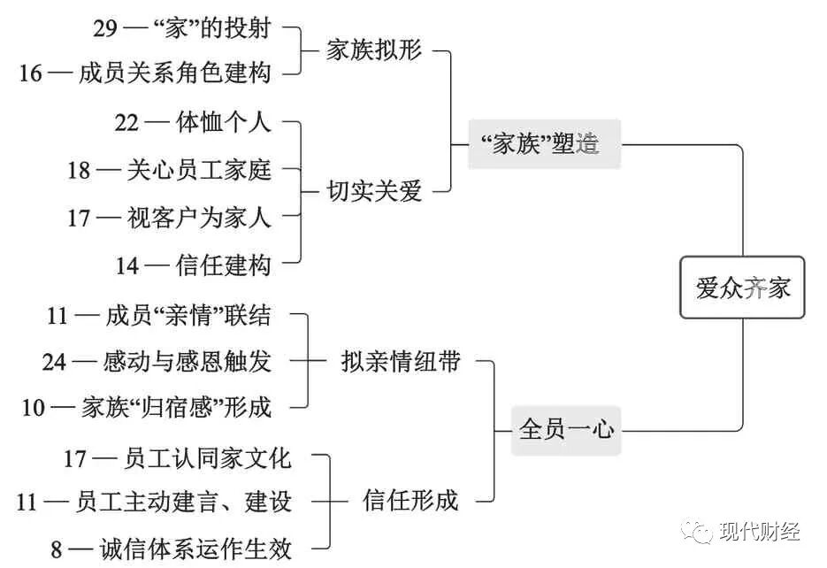 综上可知,“家族”塑造的关键在于企业与全体员工之间的情感建构,企业的“家族”塑造得到了员工的呼应,每位员工愿意将企业当作一个整体的“家族”,将来自于传统家族中高信任、高协同的情感发挥在工作中,形成全员一心的工作风貌。这些数据反映出企业对家文化的践行贯彻了“泛爱亲仁”的理念,规避了传统家族任人唯亲的局限。故此,本研究进一步将两个三级编码“家族”塑造和“全员一心”提炼为爱众齐家(编码过程详见图2,关键概念数据列举见表3)。