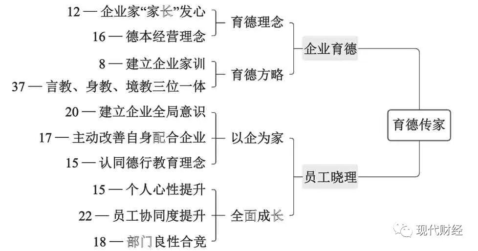 研究发现,6家企业均将全体员工视为“企业家人”,重视对全员德性的育化,依靠家文化教育形成全员对德性的追求与共识。可以说,教育成为了家文化在企业落地的重要手段,且教育的目标在于育德。与德性教育相关的条目成为开放性编码反复涌现的一项核心特征,根据初始条目,研究通过层层抽象提炼出育德理念、育德方略两个三级范畴,并最终形成企业育德这样一个四级范畴。