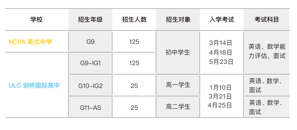 【招生】:招初三学生、入学考试分为笔试和面试,笔试考数学英语、面试考口语+个人展示。