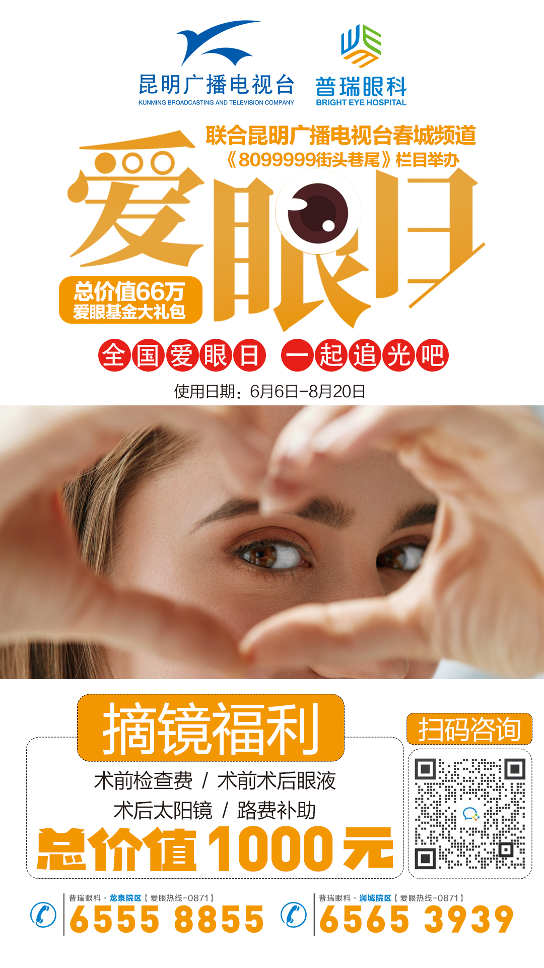 “青少年近视了怎么办?”“成年了近视度数还会增加吗?”“近视该如何防治?”“近视是否可以通过手术矫正?”“摘镜前摘镜后要注意些什么?”6月5日上午昆明普瑞眼科医院范光忠院长将在8099999抖音号、视频号进行网络直播为您详细解答近视那些事……