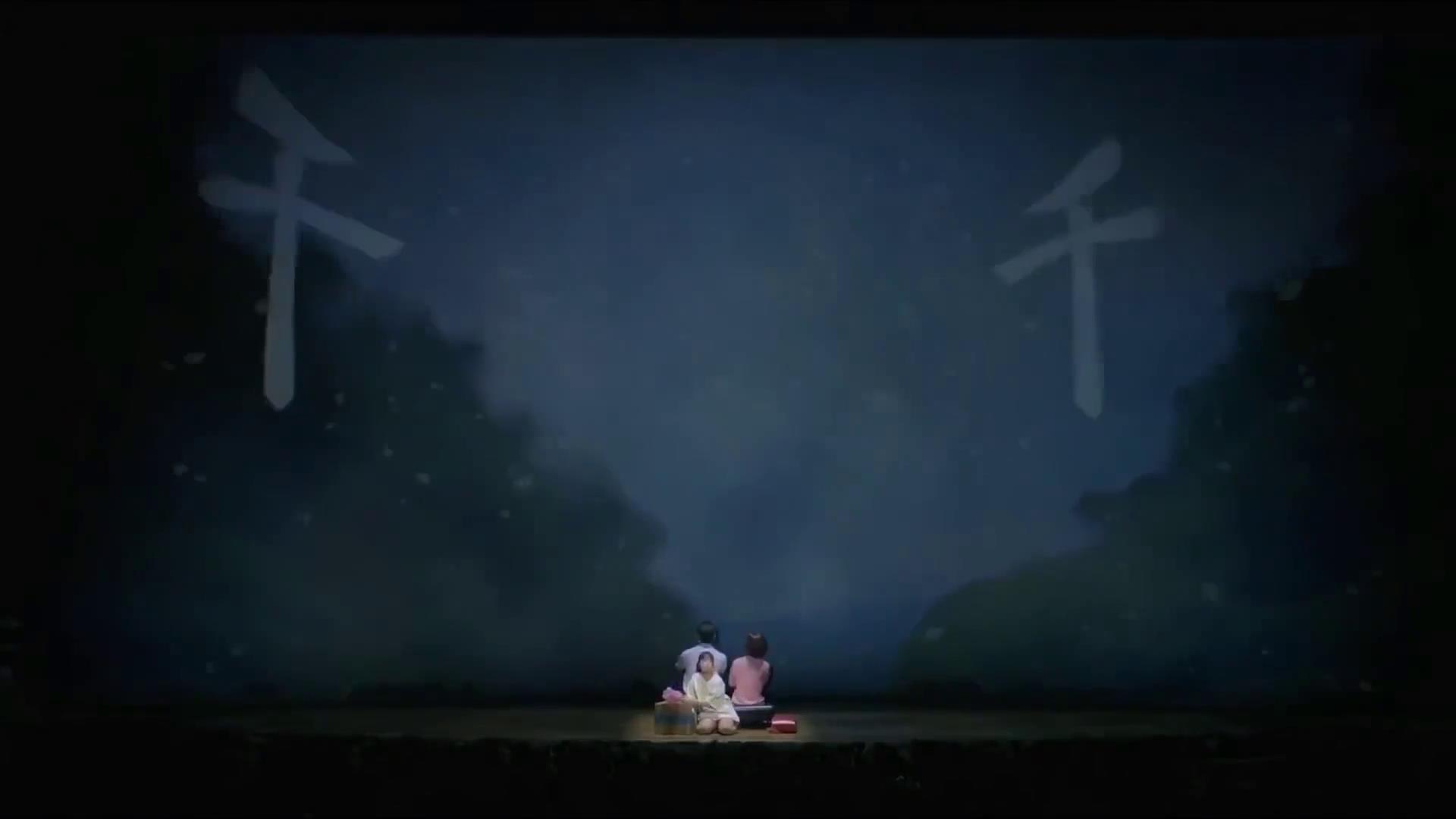 我最喜欢的是开场的动画,父母假装在开车,千寻侧卧在他们身后,模拟在车上的样子,舞台上的大屏幕,播放着山区的美景,突然“汽车”一阵颠簸,他们到了一个陌生的地方,全场灯光调暗,红色的鸟居神社飘落,屏幕上缓缓地展现出4个字,“千与千寻”