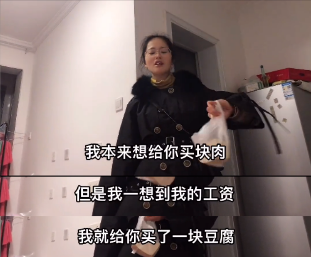 本想给丈夫亮亮买块肉,但想想自己工资,还是买了块豆腐。