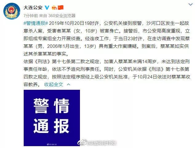 据大连市公安局官方微博通报 ,10月20日19时许,公安机关接到报警,沙河口区发生一起故意杀人案,受害者某某(女,10岁)被害身亡。