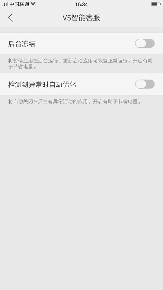1、在 设置 > 电池,找到【V5智能客服】后关闭“后台冻结”,关闭“检测到异常时自动优化”;