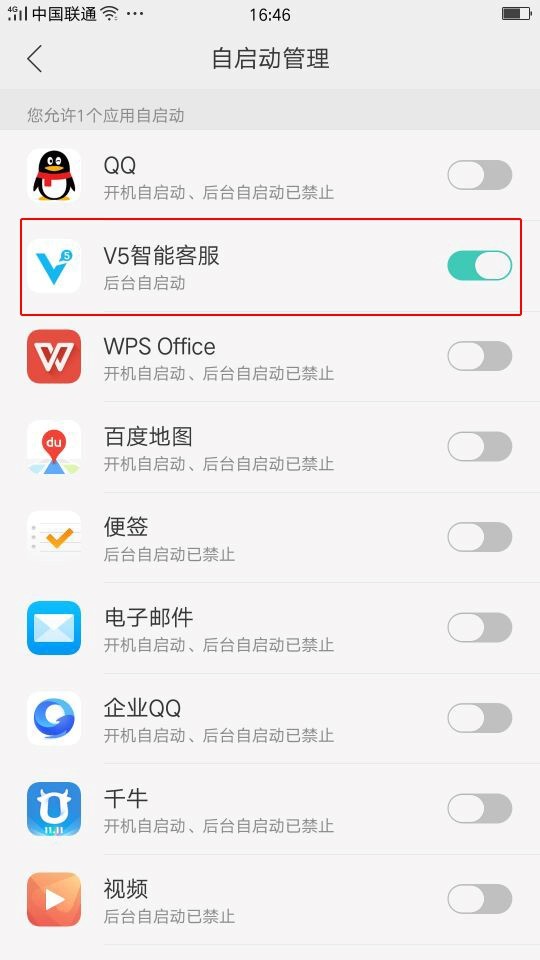2、在 手机设置 > 权限管理 > 自动启动管理,找到【V5智能客服】开启开关;