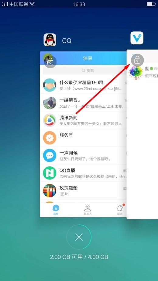 2、在手机左下角的正方形 功能键 > 进入多任务页面,向下滑动应用的界面,缩列图上出现锁图标即可。