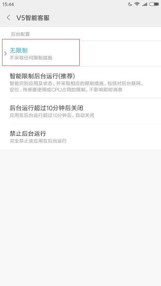 2、在手机 设置 > 电量和性能 > 神隐模式 > 应用配置,找到【V5智能客服】后点击无限制。