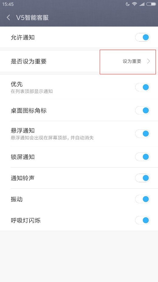 3、在 设置 > 全部设置 > 通知管理,找到【V5智能客服】设置为允许通知。