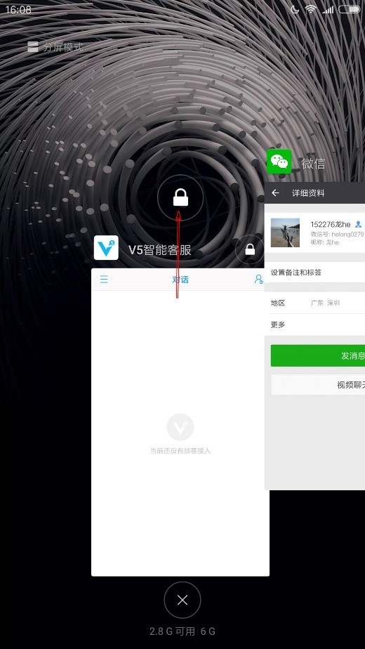 5、点击手机右下角的正方形 功能键 > 进入多任务页面 > 找到【V5智能客服】,下拉应用锁定。