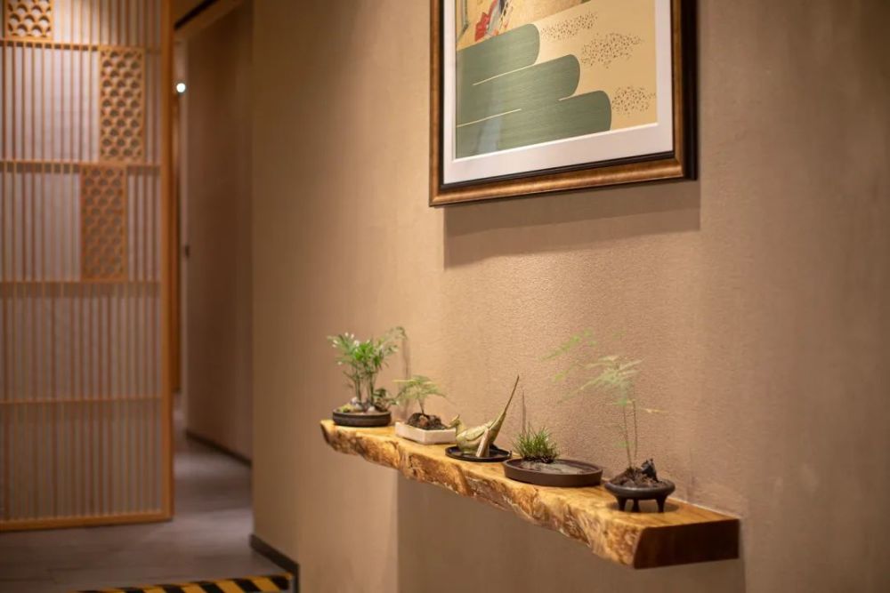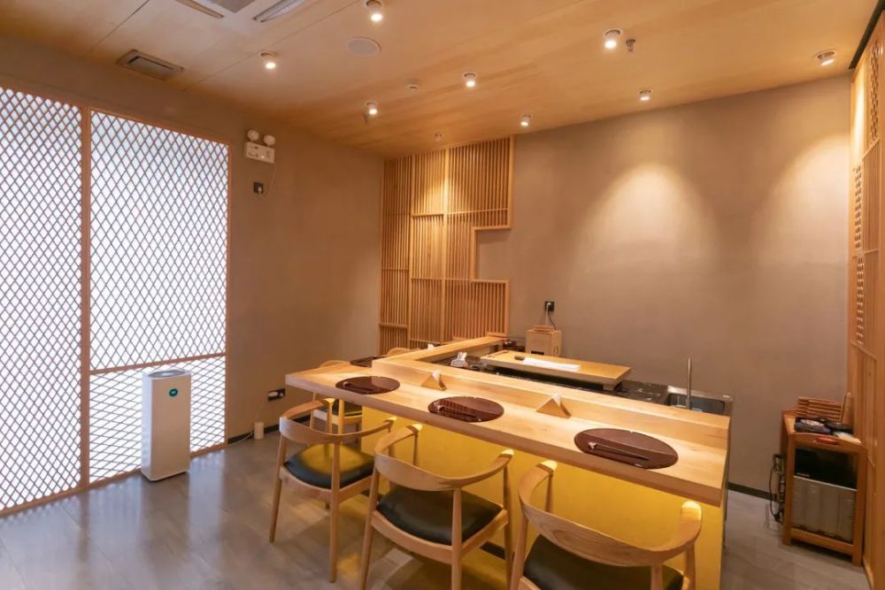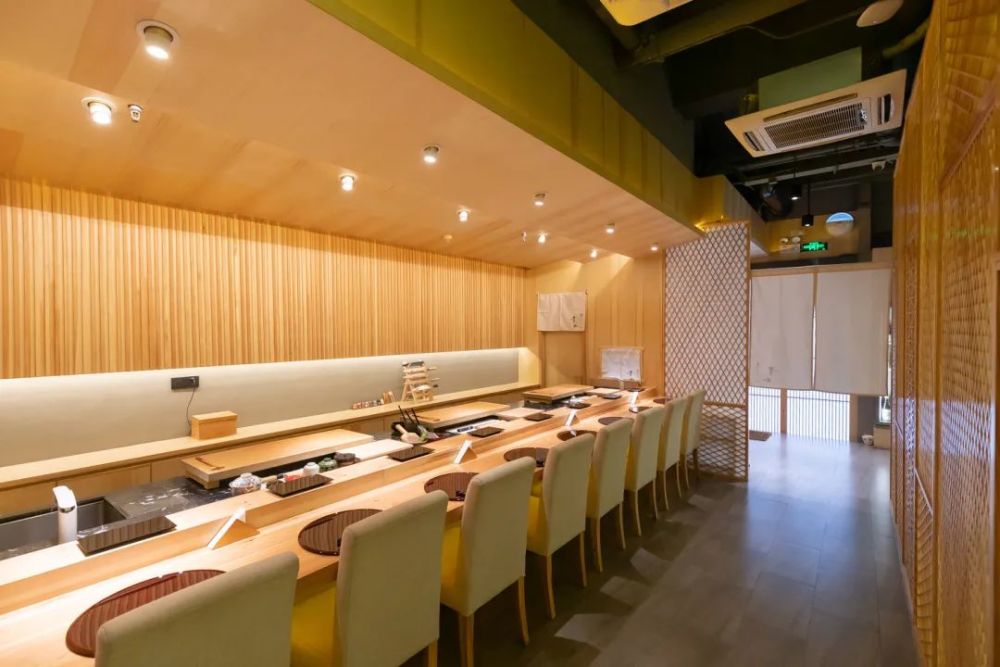 所谓大隐于市,小隐于野,鮨·青木隐在并不起眼的民居一层,若不是见到门口透出青木二字,一下子就走过了。拨开暖帘,木纸石花和式元素随处可见,空气中还有木的余香。店内分两部分,大厅有8个位置,个室6个位置。大厅大气开扬,个室清静简约。