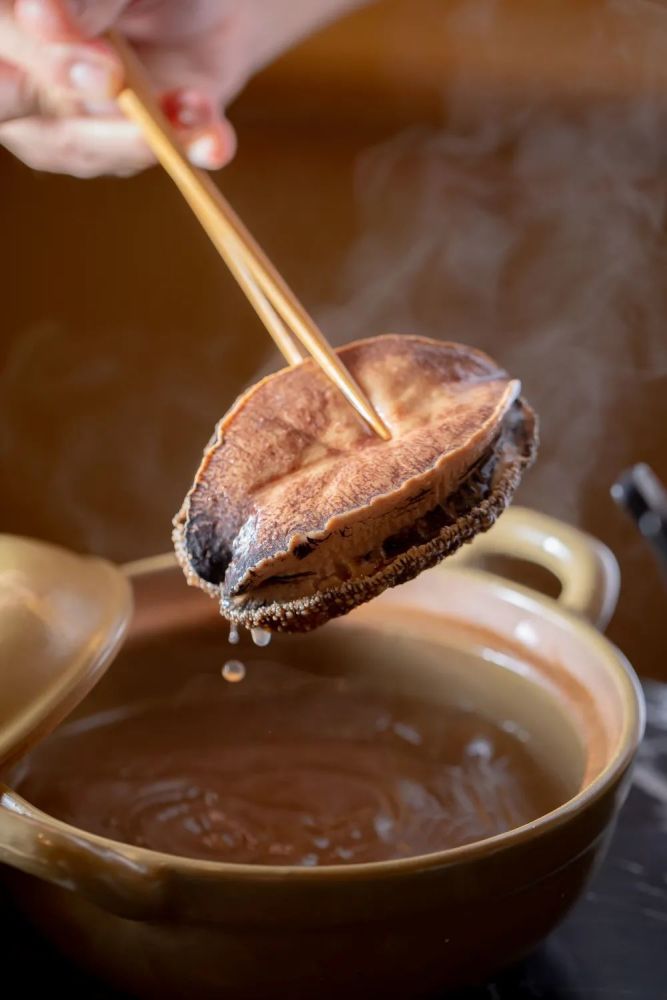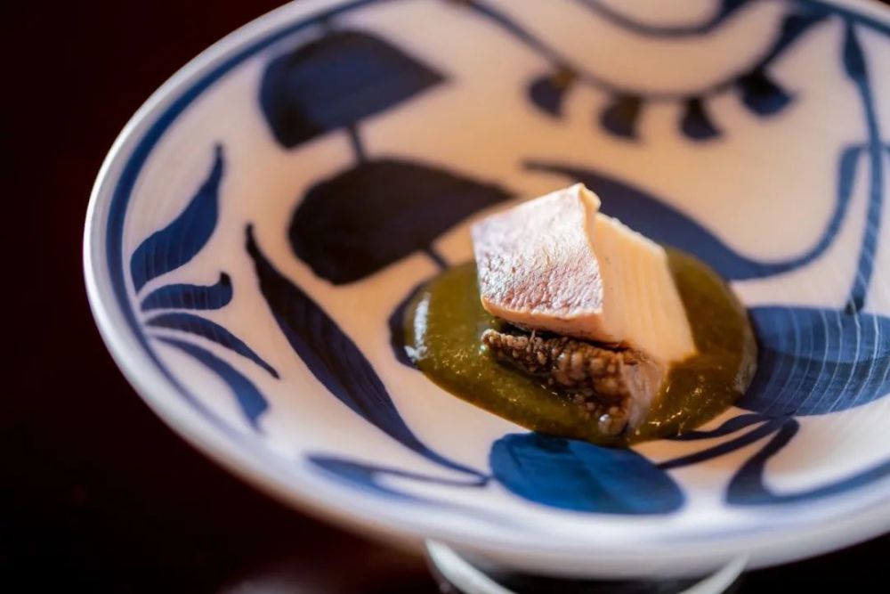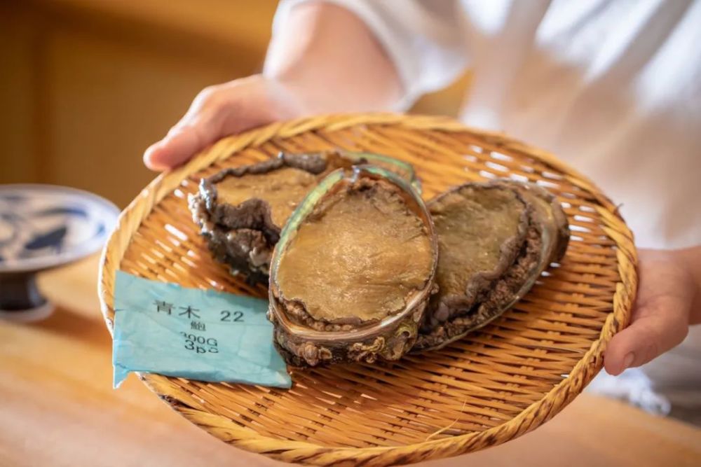 两头的澳洲青边鲍,用清酒蒸煮3小时,配以自身的肝做出来的鲍鱼肝酱,口感Q弹,肉质顺滑,既带有海水的鲜咸,又有清酒的清香。