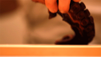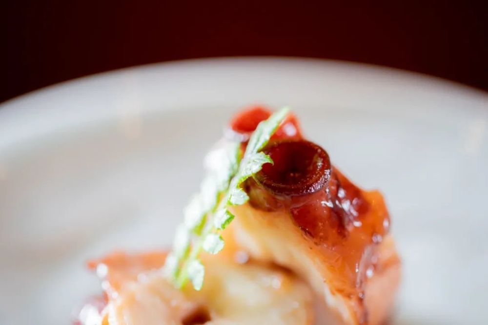 这道软煮八爪鱼,加上了木之芽(也就是山椒叶),用味淋、酱油等煮过的八爪鱼口感软绵,山椒叶的微微辛味又带出了八爪鱼的鲜味。赞了赞了。