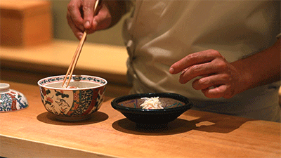 车海老又叫车虾、斑节虾等等,在刺身的情况下,车虾的鲜味和甜味物质并不能完全释放,而为了保证客人吃到最佳状态,青木的师傅会在这一贯上菜之前才剥壳烹制,并且用精确到秒的烹煮时间来控制半生熟的车虾状态。