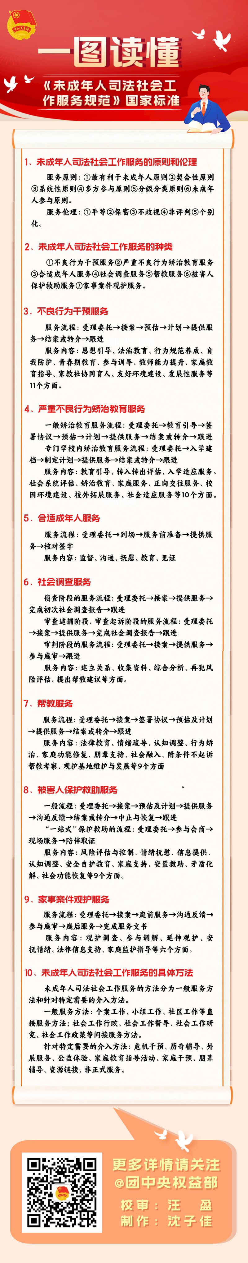 《未成年人司法社会工作服务规范》由民政部、最高人民检察院、共青团中央提出,国家市场监督管理总局国家标准化委员会3月17日发布,由相关省市共青团组织、检察院、法院、公安机关、高校、青少年社会工作机构等起草完成,是各地共青团组织与检察机关历经4年工作的实践成果,是未成年人司法社会服务工作领域的第一项国家标准。