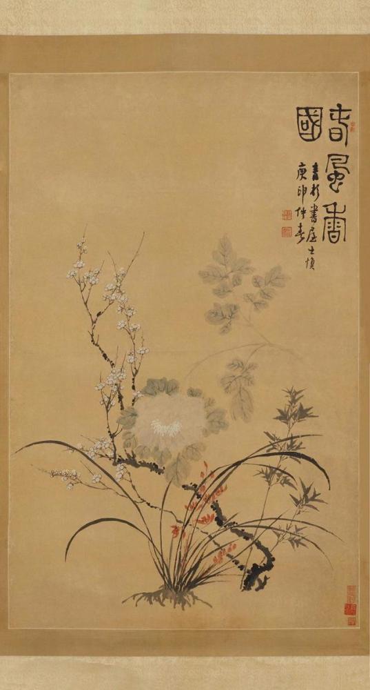 全图突出一个“香”字,表现春天的勃勃生机。在汪士慎的笔下,春天不是百花争艳,万紫千红,而是冷艳清丽,幽香缥缈,悄然生长着的稚嫩的梅枝和幽篁,随风摇曳的兰花,甚至白牡丹,也变得幽雅而含蓄。这正是汪士慎独特的审美趣味。