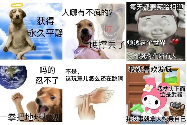 从这个角度来看,“发疯文学2.0”似乎是话语空间一场成功的博弈。中国社会的文化传统要求君子“喜怒不形于色,好恶不言于表”,现代社会追求效率的原则期待年轻人“做一个情绪稳定的成年人”,在这样的环境下,情绪表达本身的阻力是很大的。“是不是在炫耀”“是不是在矫情”“谁没经历过呢”……诸如此类的审判堵塞了很多年轻人的情绪出口。(发疯表情包其一)在“发疯文学2.0”里,这些顾虑都可以被忽略,剥去小心翼翼的外壳,年轻人主动选择极端的表达,披着失智寻“死”的保护色,对着旷野大吼大叫,对着空气拳打脚踢。然而,如果只把“发疯”看作一种情感的宣泄,那么我们很可能会不无担忧地看到,年轻人的“疯”是发不完的,他们甚至不排斥让自己陷入越来越频繁的“发疯”之中。似乎“疯”的情绪正源源不断地涌动在年轻人的心中,这也暗示我们“发疯文学2.0”绝不是偶然产生的。那么,那些被“发疯”的极端表达遮蔽了的具体问题,究竟是什么?在“发疯文学2.0”的一些表述中,我们可以找到蛛丝马迹。