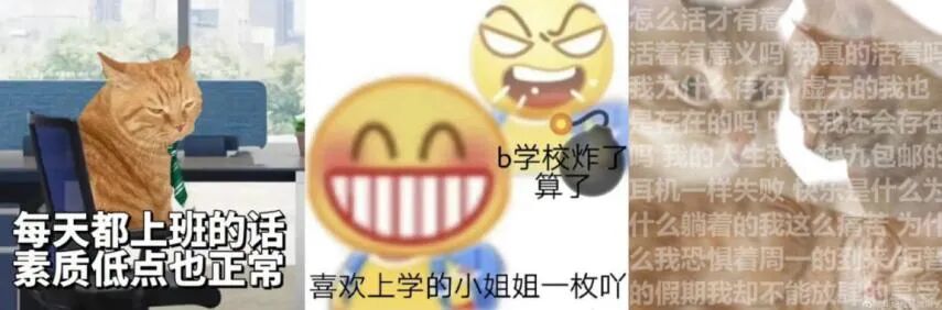(发疯表情包其三)如果说过去的年轻人还可以充满激情地学习如何处理职场关系、如何纾解工作压力,现在的他们已经开始感到疲怠。面对近在眼前的“胡萝卜”,他们从积极争取转向反思与怀疑,开始重新审视外部世界。从抱怨“996”、拒绝“内卷”到无法彻底“躺平”,外部世界真实存在的种种压力迫使他们追问更多,他们希望改变能尽快发生,他们需要有人为此负责,但对复杂现实社会的理性思考又使得他们挥拳不能指向任何人。所以他们只能对着旷野和空气宣泄,做一些“毁灭世界”的反派美梦。这种面对外部世界的“发疯”,与过去持续被讨论的“精神内耗”其实是相联系的。一个向外,一个向内,共同投射出当代年轻人的精神状态。向内面对自我,他们是扎根在现代性里成长起来的一代,先天难逃异化的病症,又被资本的逻辑绑架,期待自己是“有用”的。向外面对世界,他们成长于中国经济上行、社会蓬勃发展的时期,面对后疫情时代的挑战,旧有的经验常常失效,他们想知道生活还会不会像从前一样,还有没有机会能让他们证明自己是“有用”的。自我与世界就这样被撕裂、对立。