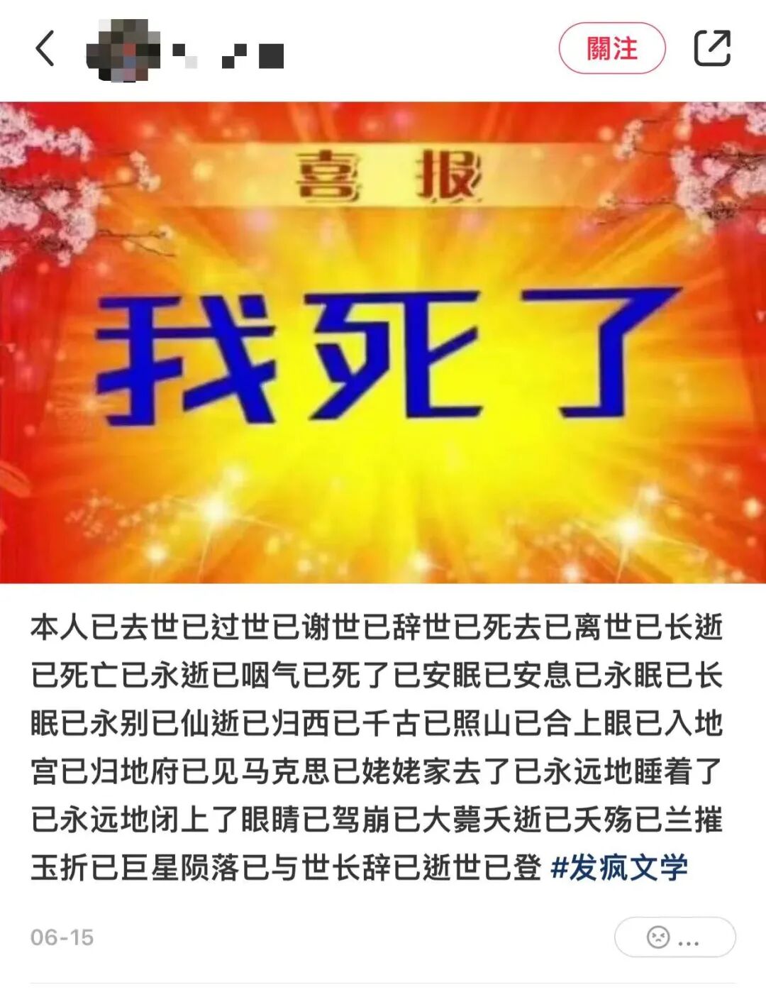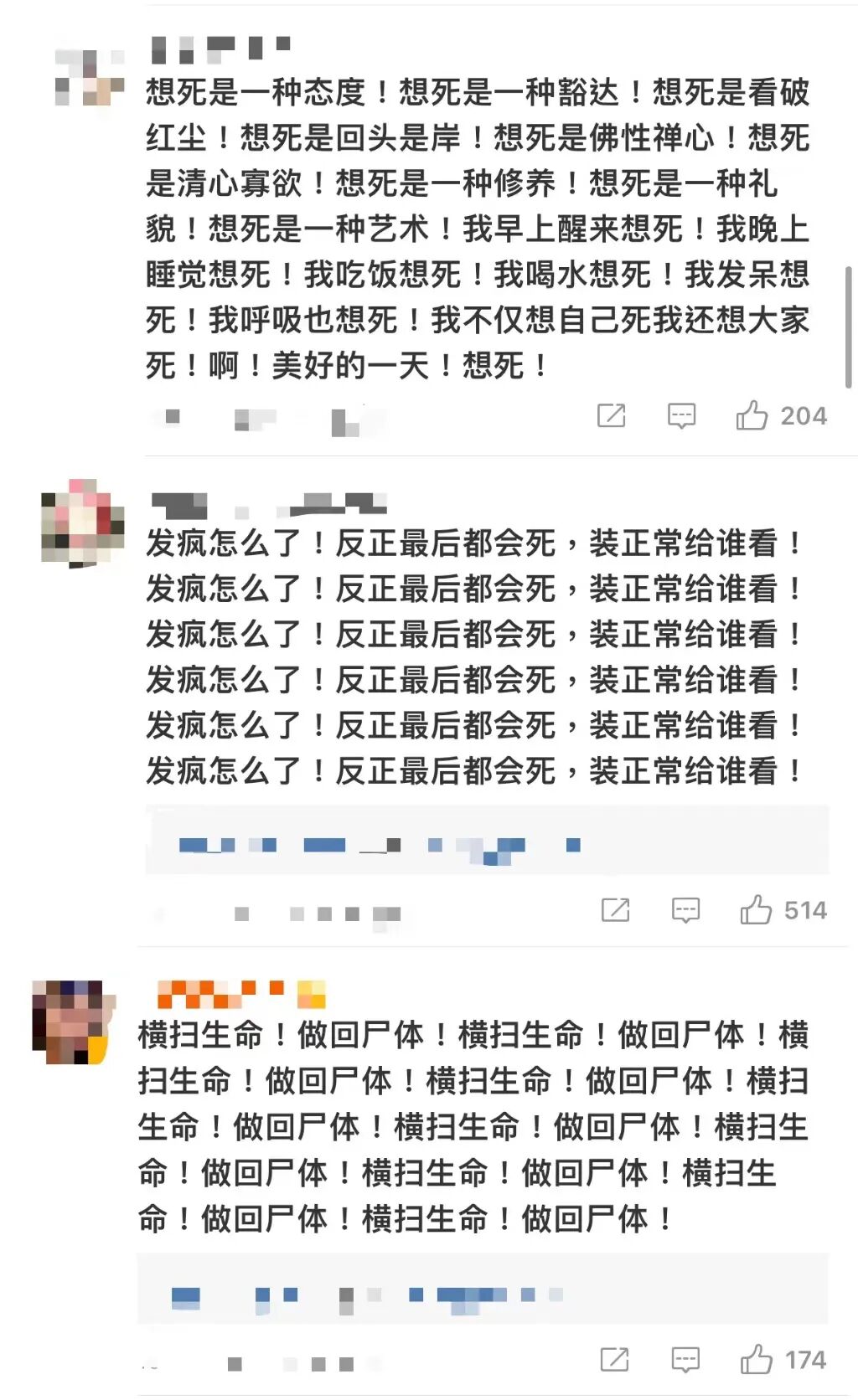 (寻“死”的发疯文案)在内部和外部世界的双重挤压下无处可逃的年轻人,不可避免地走上了对生命意义和死亡的思考,也就出现了“发疯文学2.0”里看起来极端消极的内容。中国传统是讳谈“死”的。抛去迷信的因素,死亡在多数人看来仍然是令人恐惧的、消沉的,这也解释了为什么一部分人在看到与之相关的“发疯”文字后,不会有情绪宣泄的畅快感,反而担忧年轻人们会陷入负面情绪的深渊。