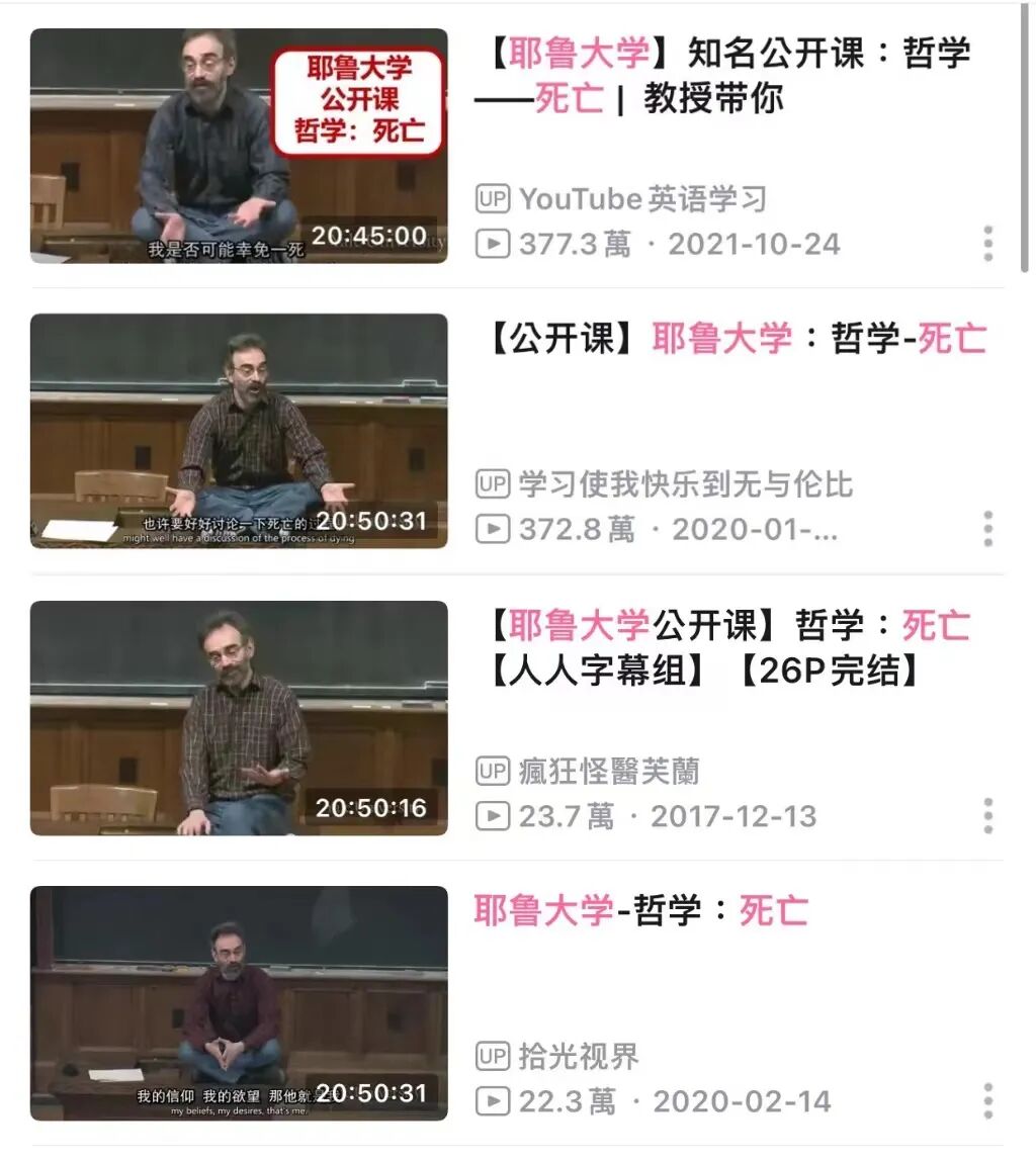 (西西弗斯神话对生命的隐喻)假设如加缪所说,个体荒诞感的激发来自生活中惊觉似的偶然,那么在年轻人越来越严峻的生存困境和越来越拧巴的精神状态下,这种偶然惊觉的概率无疑被大大提高了。寻“死”的“发疯文学2.0”得以流传开来,也就成为一种必然。近几年,网友们陆续在B站上传耶鲁大学《哲学:死亡》课程视频,这是一门硬核的哲学专业课,迄今却累计获得了超过800万的播放量,众多年轻人在其中寻找灵魂存在与否的答案,探索永恒与不朽的可能性,体悟生命的价值,学习如何面对死亡的恐惧以及死亡本身。对于风华正茂的年轻人来说,这一举动似乎为时过早,而在他们自己看来,这却是对早就缺失的“死亡教育”的自我补偿。