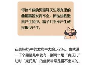 病理性的男性乳房女性化1,青春期男孩男性乳房发育症多发生在青春期,青春发育期的男孩常可出现无明显激素异常的乳房女性化,有时可持续至青春期后,常与先天性睾丸发育不良有关,传统将其描述为克氏综合征的症状之一。这样的患者有时具有女性化征象,如声音尖锐、无胡须、无喉结、臀部宽阔等,同时伴有生殖器畸形,如假两性畸形、尿道下裂或隐睾等。