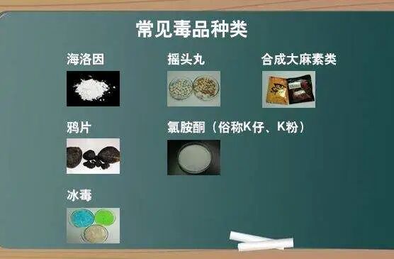 毒品的种类有三类:天然毒品、半合成毒品和合成毒品。天然毒品是直接从原植物中提取的毒品,如鸦片、大麻、罂粟。半合成毒品是由天然毒品与化学物质合成的,如海洛因、吗啡、可卡因。合成毒品又称“俱乐部毒品”、“休闲毒品”,是用化学物质合成的,常见的有冰毒、麻古、摇头丸、K粉。近年来出现了一些新型毒品,主要有奶茶、丧尸药(浴盐)、止咳水、跳跳糖、神仙水、邮票毒品、火狐狸。