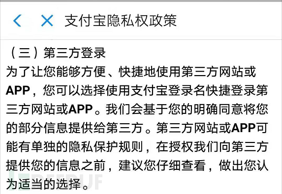 例如支付宝,很多APP使用支付宝账号进行登录,那就很定会涉及支付宝把其收集的信息提供给了第三方APP。这里仅说明了隐私政策,其实在APP功能中也应该有用户的授权操作行为。