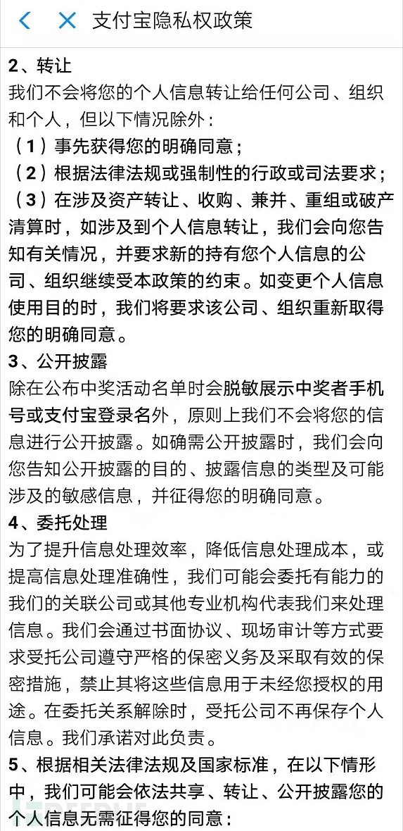 例如,支付宝转让、公开披露、委托处理都有涉及: