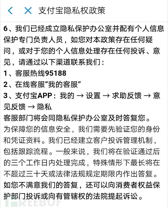 隐私政策中至少提供以下一种授诉渠道,并且说明投诉处理的时间周期。
