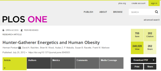 2012年,Pontzer研究团队在PLOS ONE上发表了题为“Hunter-Gatherer Energetics and Human Obesity”的研究成果(图2)[2]。该项研究以非洲最后一个仍以狩猎和采集为生的部落——坦桑尼亚的Hadza部落为研究对象,通过对比现代西方生活方式和原始部落生活方式,探索西方生活方式的哪些方面对人类来说是构成肥胖的最大风险。