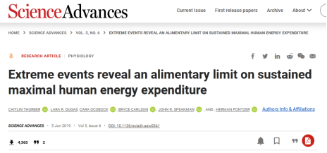 2019年6月5日,Pontzer研究团队在Science Advances发表题为“Extreme events reveal an alimentary limit on sustained maximal human energy expenditure”的研究结果(图3)[3]。研究发现在持续的、大强度耗能的情况下,人体的代谢水平会降低,并趋于一个稳定的状态。最终的稳定状态只有基础代谢率,也就是维持基本生命所需的最低能量消耗的2.5倍。