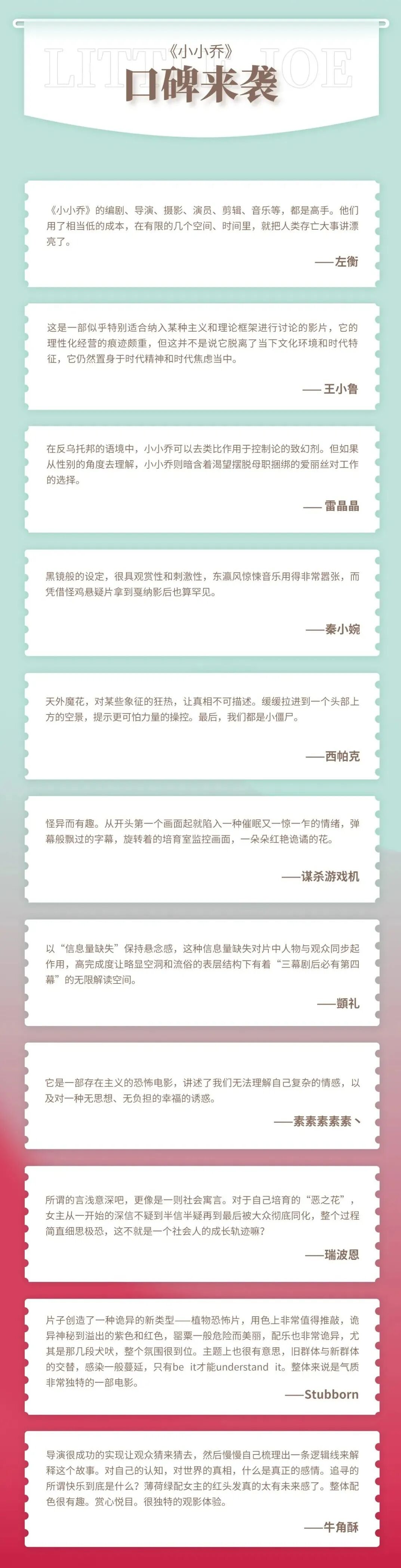 《小小乔》是一部科幻与心理惊悚交织的电影,探讨基因改造工程带来的伦理道德困惑,剖析当代社会中人情的异化,用大胆的视听语言,呈现了一幅奇异的后现代图景。影片入围第72届戛纳国际电影节主竞赛单元,主演艾米丽·比查姆凭借本片获得戛纳电影节最佳女演员奖。