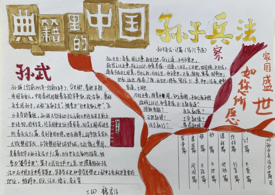 《孙子兵法》,中国现存最早的兵书,也是世界上最早的军事著作,至今流传千年,依然熠熠生辉。孙子曰:“兵者,国之大事,死生之地,存亡之道,不可不察也。"我们知兵,重战,慎战,但我们认为“战”是为了“不战”,战争不是争权夺利的筹码,而是守一方平安的武器。中华民族热爱和平,坚信止戈为武,践行“铸剑为犁”。这一思想已融入了我们的文化基因里,流淌在每个中华儿女的血液中。让我们来听听初一8班淮敦博同学对《孙子兵法》的深刻解读。
