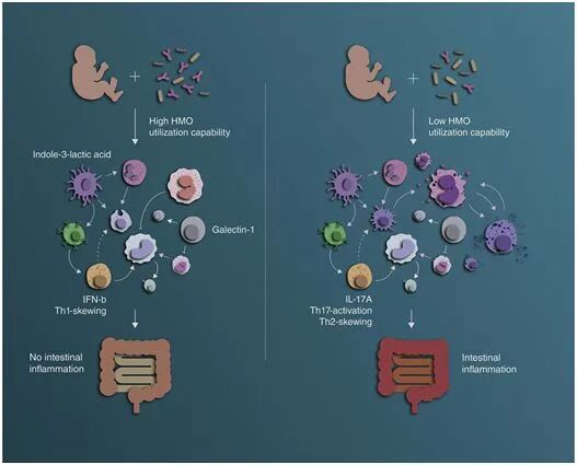 早些时候的研究已表明,在自身免疫疾病发病率低的国家,双歧杆菌(bifidobacteria)在母乳喂养的婴儿中很常见。母乳含有丰富的人乳低聚糖(human milk oligosaccharide, HMO),婴儿无法自行代谢HMO。这些复杂糖类的产生反而与滋养特定肠道细菌的进化优势有关,这些肠道细菌在婴儿的免疫系统中发挥着重要作用。双歧杆菌就是这样一类细菌。