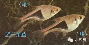 蓝三角色鱼属草上卵生鱼类, 8 个月性腺发育成熟。雄鱼细长,“黑三角”斑在胃下方一角,较尖锐,产卵期体色浓艳,雌鱼比雄鱼粗壮,怀卵期腹部明显膨大。