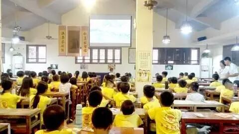 在学宫文化广场的一幢建筑里,150多名儿童身着统一印着“爱”字的黄色服装,在老师的引导下学习有关孝亲、尊师等传统文化知识。整个课堂充分利用与“守信”、“友爱”等主题相关的书法作品或贴图,营造以国学为主题的课堂氛围。