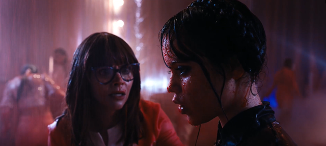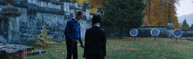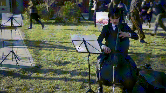 这也是星期三最酷的镜头。铜像起火,随着人群四处逃散,她在中央处变不惊地拉着《维瓦尔第:冬季》。