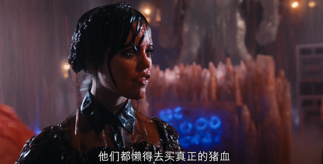洒向嘉莉的是猪血,后者用的则是红色颜料,这也是为什么星期三会吐槽: