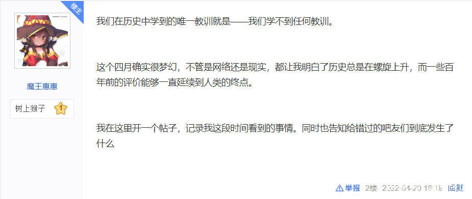 当然,就跟他在“记星海历2022年四月母星肃正之乱”一贴中记载的一样,人类从历史上吸取的唯一教训就是人类从来不会吸取教训。就在去年6月,stellaris吧也曾因为小团体作祟爆发过一场大型内战,而这也是为何如今stellaris吧的吧友们如此厌恶的“贴吧政治”的原因。