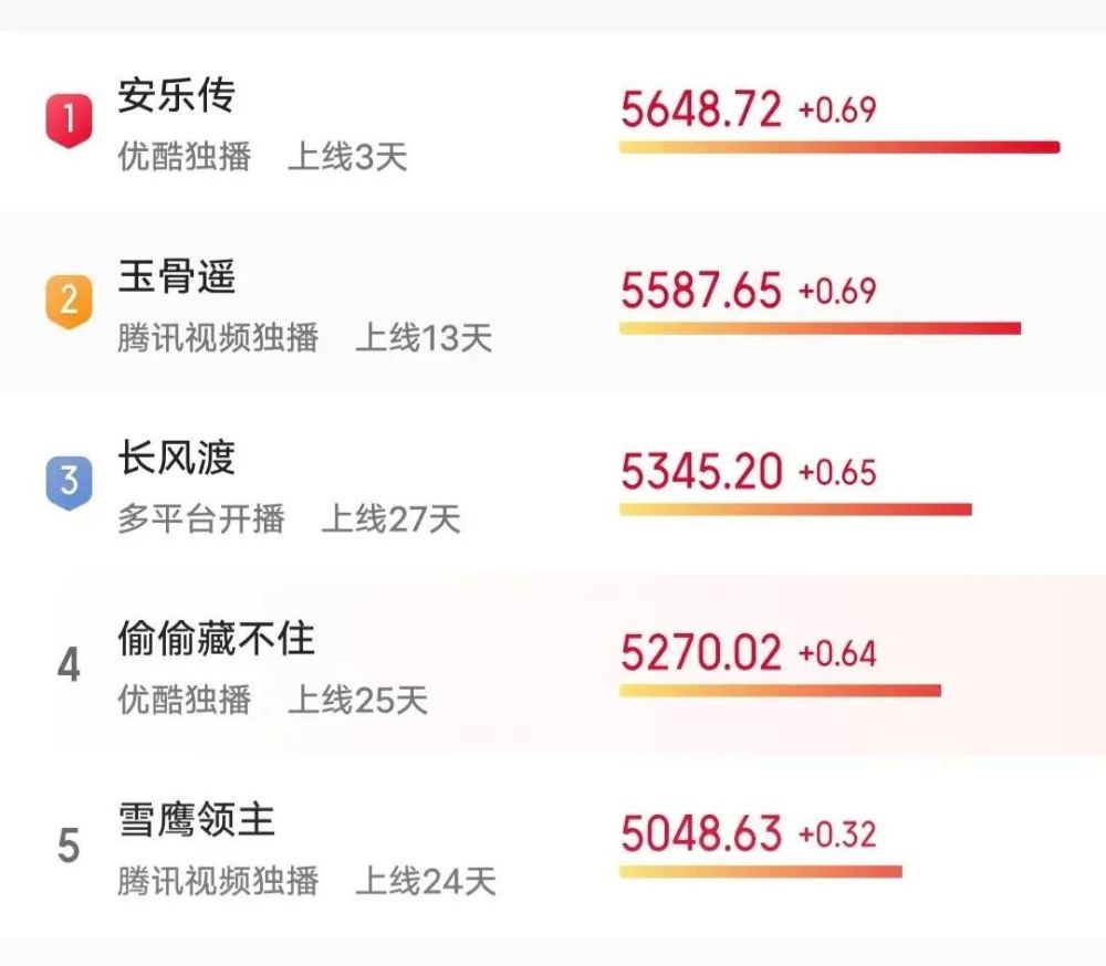总结一下,这几部剧虽然各有特色,抛开班底制作不讲,其实拼的就是主演们的流量,热度榜单目前是这样的,我放下面了。