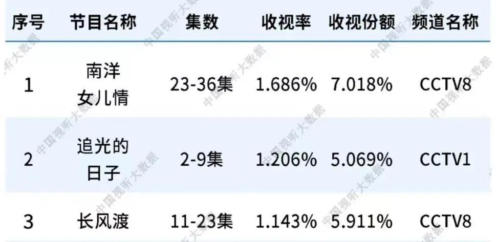 而在电视端这块收视,在暑期档当然比不过网剧的势头,上线央八的《长风渡》排第三,郭京飞、王源、任敏主演的《追光的日子》排第二,而第一就是刚完结的“郭靖宇团队”力捧剧《南洋女儿情》。