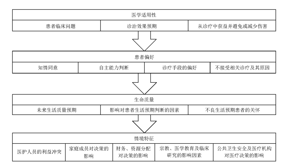 Jonsen等[6]在其著作《临床伦理学》中提出了解决临床伦理问题的“四主题理论(four topics)”模式,包括医疗适用性、患者偏好、生命质量和情境特征4个主题,其核心流程见图1。
