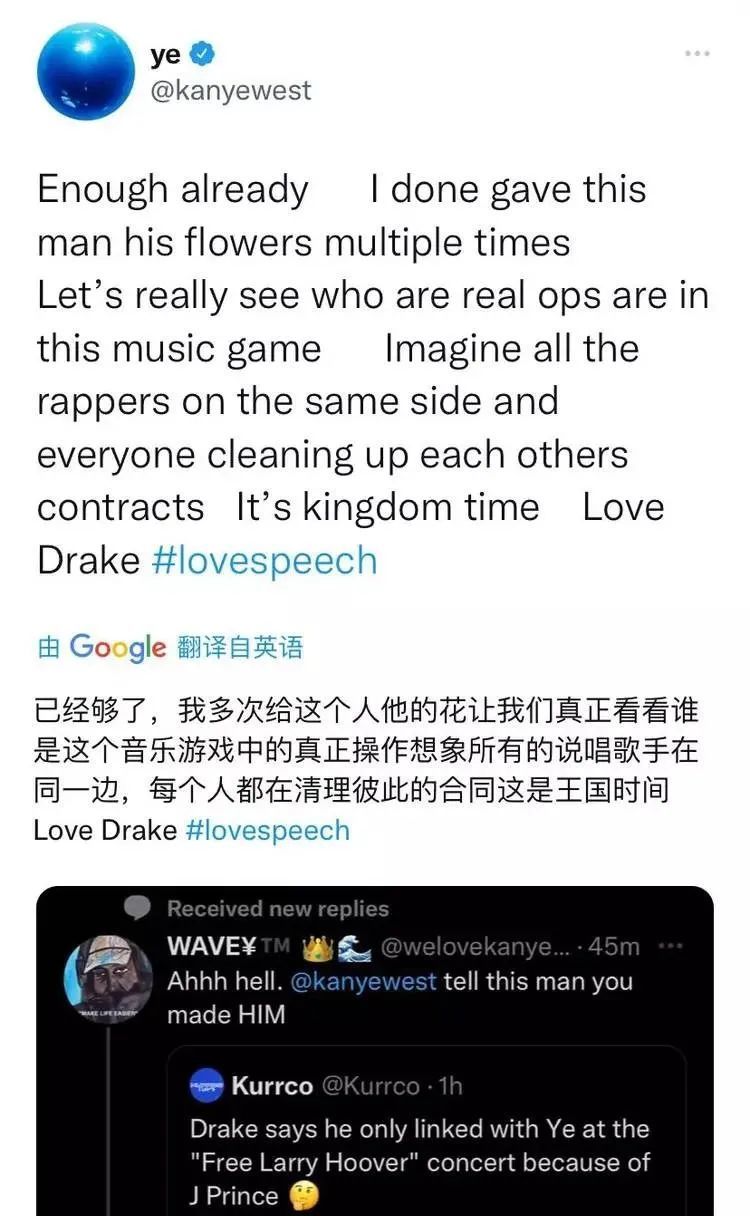 尽管如此,弱小可怜无助的kanye还是只能在社交媒体上继续传播他的爱,在默默的输入「love drake」后点击发送。