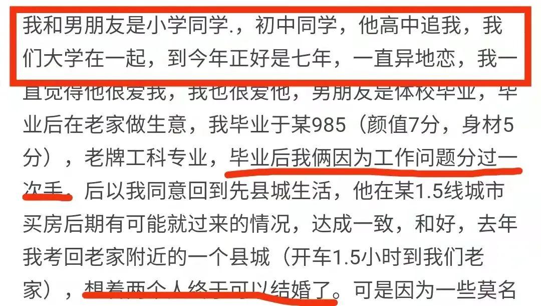 双方并没有协商好毕业后两人一致的奋斗目标,最后女方妥协,同意靠回家附近。跟男方能够更近一点。