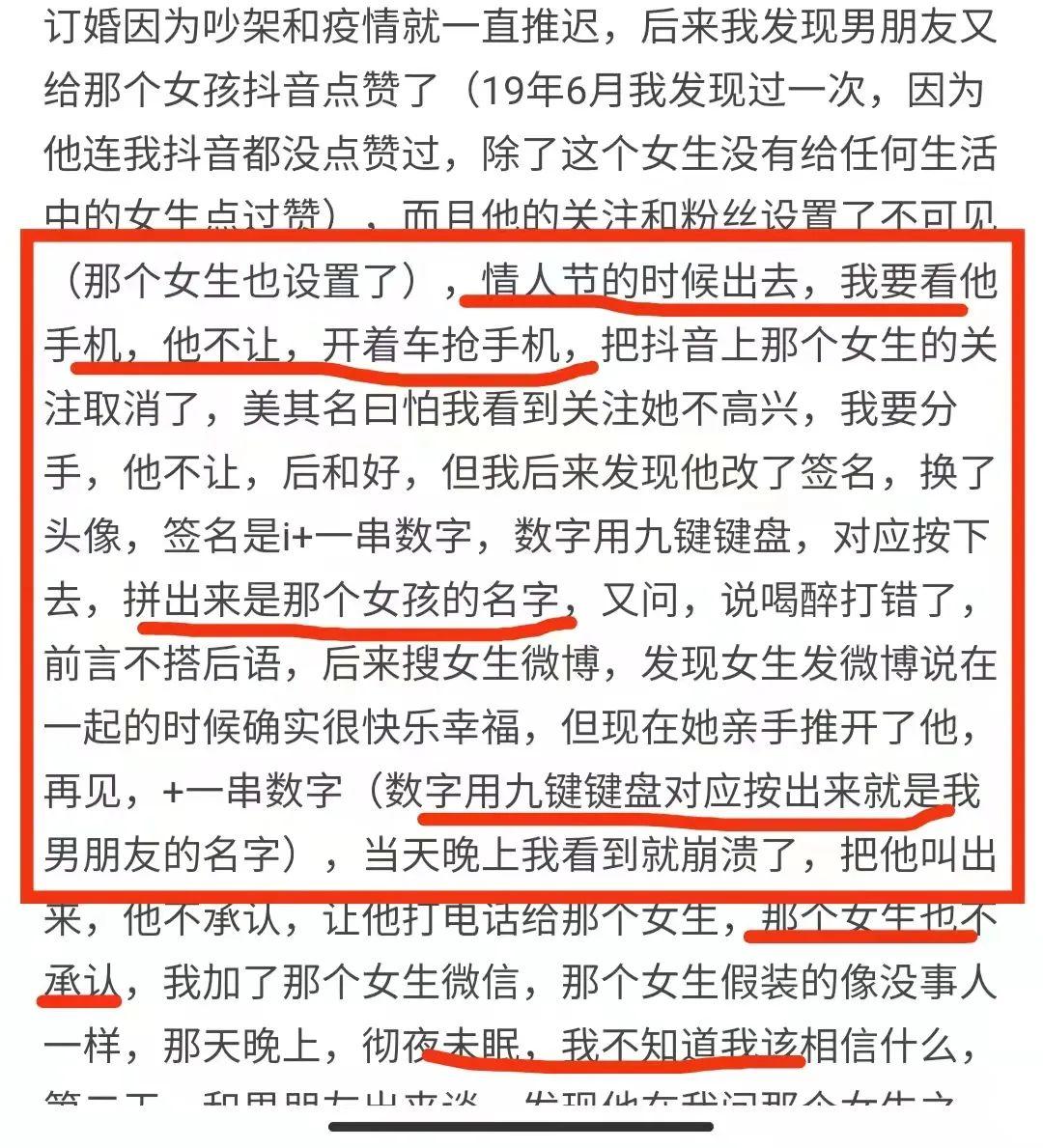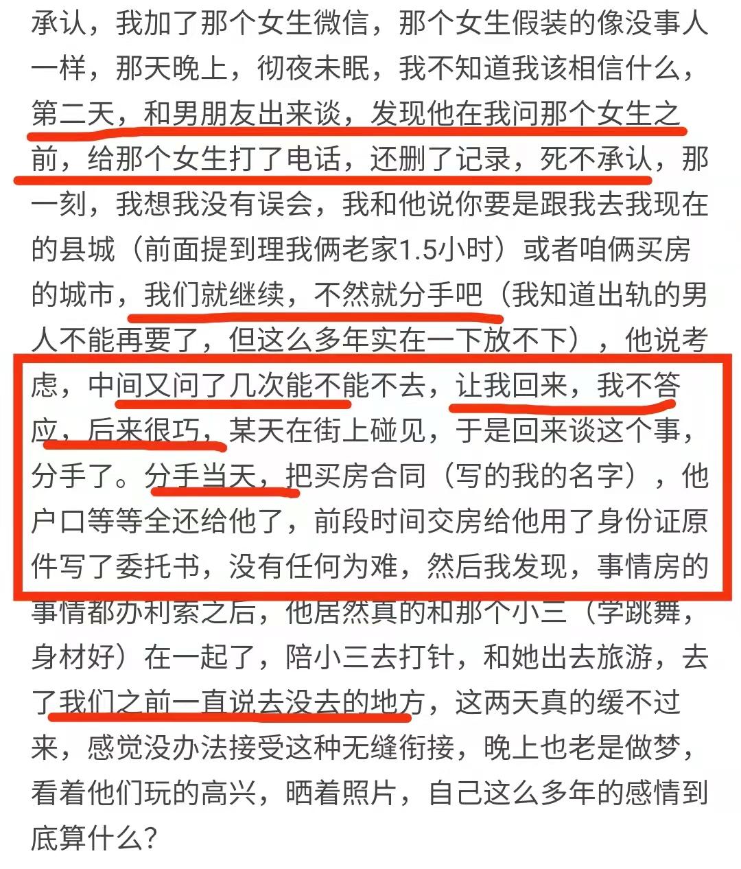 我和男朋友是小学同学.,初中同学,他高中追我,我们大学在一起,到今年正好是七年,一直异地恋,我一直觉得他很爱我,我也很爱他,男朋友是体校毕业,毕业后在老家做生意,我毕业于某985(颜值7分,身材5分),老牌工科专业,毕业后我俩因为工作问题分过一次手,后以我同意回到先县城生活,他在某1.5线城市买房后期有可能就过来的情况,达成一致,和好,去年我考回老家附近的一个县城(开车1.5小时到我们老家),想着两个人终于可以结婚了。可是因为一些莫名其妙的事情,两个人总是吵架,比如必须一结婚就生孩子(他以前同意30岁以前生小孩就可以),必须生出男孩,我出去吃饭不会来事等等,也冷战了好几次,以前这么多年从来没冷战超过一天,原本定于正月16的订婚因为吵架和疫情就一直推迟,后来我发现男朋友又给那个女孩抖音点赞了(19年6月我发现过一次,因为他连我抖音都没点赞过,除了这个女生没有给任何生活中的女生点过赞),而且他的关注和粉丝设置了不可见(那个女生也设置了),情人节的时候出去,我要看他手机,他不让,开着车抢手机,把抖音上那个女生的关注取消了,美其名曰怕我看到关注她不高兴,我要分手,他不让,后和好,但我后来发现他改了签名,换了头像,签名是i+一串数字,数字用九键键盘,对应按下去,拼出来是那个女孩的名字,又问,说喝醉打错了,前言不搭后语,后来搜女生微博,发现女生发微博说在一起的时候确实很快乐幸福,但现在她亲手推开了他,再见,+一串数字(数字用九键键盘对应按出来就是我男朋友的名字),当天晚上我看到就崩溃了,把他叫出来,他不承认,让他打电话给那个女生,那个女生也不承认,我加了那个女生微信,那个女生假装的像没事人一样,那天晚上,彻夜未眠,我不知道我该相信什么,第二天,和男朋友出来谈,发现他在我问那个女生之前,给那个女生打了电话,还删了记录,死不承认,那一刻,我想我没有误会,我和他说你要是跟我去我现在的县城(前面提到理我俩老家1.5小时)或者咱俩买房的城市,我们就继续,不然就分手吧(我知道出轨的男人不能再要了,但这么多年实在一下放不下),他说考虑,中间又问了几次能不能不去,让我回来,我不答应,后来很巧,某天在街上碰见,于是回来谈这个事,分手了。分手当天,把买房合同(写的我的名字),他户口等等全还给他了,前段时间交房给他用了身份证原件写了委托书,没有任何为难,然后我发现,事情房的事情都办利索之后,他居然真的和那个小三(学跳舞,身材好)在一起了,陪小三去打针,和她出去旅游,去了我们之前一直说去没去的地方,这两天真的缓不过来,感觉没办法接受这种无缝衔接,晚上也老是做梦,看着他们玩的高兴,晒着照片,自己这么多年的感情到底算什么?