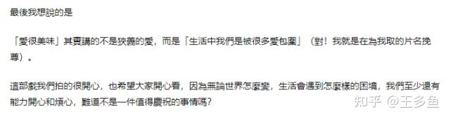 《爱很美味》上线后,陈正道在豆瓣分享创作历程,表示突如其来的疫情让人们的生活发生了翻天覆地的变化,“需要一些快乐和温暖来抚慰内心的恐慌和焦虑。”最后陈导还很卖力地为自己取得剧名挽尊。
